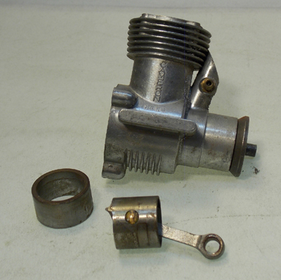 The .15 came out in the early 1960's and was a very unique design with only a steel sleeve (ring) above the cast in ports. The piston top was stepped to obtain the intake and exhaust timing. The piston rides in the cast aluminum crankcase below the sleeve. |